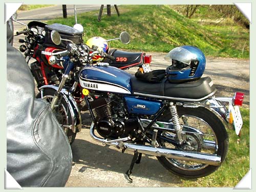 vorne Yamaha RD 250 Luftgekühlt im super Originalzustand, dah. RD 350-4L0 im klassischen Racing Trimm.